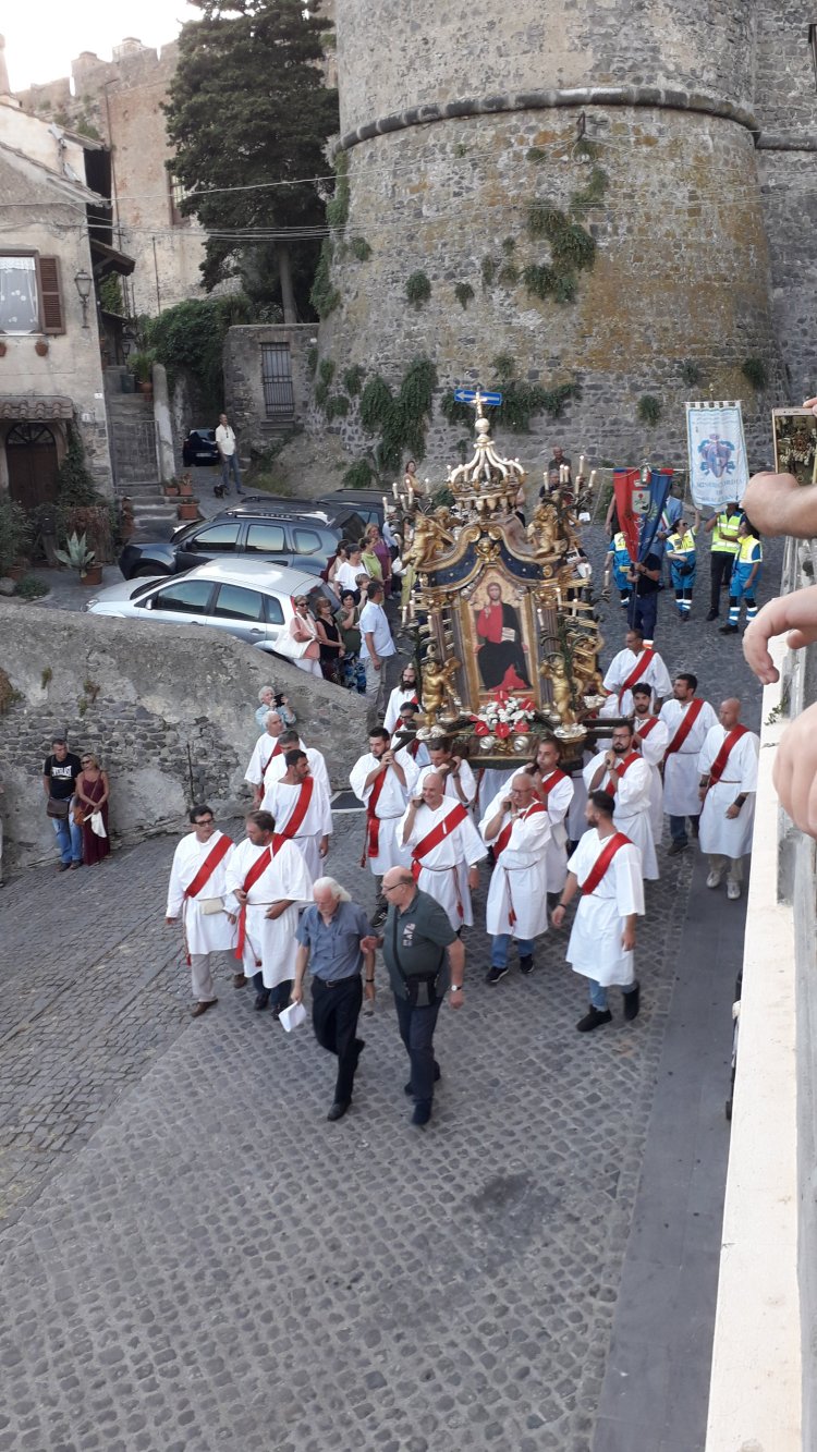 “A Bracciano il momento religioso più sentito ed atteso è il trasporto della macchina processionale del Santissimo Salvatore che attraverserà la città. Sulle spalle di circa dodici facchini, da via della Collegiata l’immagine del Santissimo Salvatore attraverserà via Principe di Napoli, fino alla sosta in piazza Formaggi, nel Rione Cartiere; da qui, al calar del sole, con una suggestiva corsa finale dei portatori, la macchina processionale rientrerà in Duomo. Pur essendo San Sebastiano il vero patrono di Bracciano, è intorno alla festa del Santissimo Salvatore che la comunità di Bracciano si riunisce più numerosa e partecipe. L’evento devozionale, ma dal sapore anche artistico e culturale, affonda le sue radici nel 1584, quando un contadino, che arava un campo nelle vicinanze del Duomo di Santo Stefano Protomartire, vide dietro ad un masso le pale del Santissimo Salvatore. L’uomo, preso da stupore, corse nel villaggio a chiamare il resto dell’allora piccola comunità di Bracciano, le pale vennero caricate su un carretto e trasportate fino al Duomo, da quegli stessi buoi, che ne avevano favorito il ritrovamento. Con il tempo si scoprì che quelle pale erano una preziosa opera d’arte; un doppio trittico in legno, realizzato nel 1315, dai fratelli Donato e Gregorio D’Arezzo. Sulle pale sono raffigurati il Santissimo Salvatore e la Vergine Maria Assunta in cielo. Da quel 1584, ogni anno la prima domenica dopo la Festa dell’Assunta, a Bracciano si rievoca il ritrovamento delle pale del Santissimo Salvatore, che oggi restaurate si possono ammirare nell’apposito museo allestito dall’Associazione Forum Clodii e dalla Parrocchia Santo Stefano di Bracciano”.